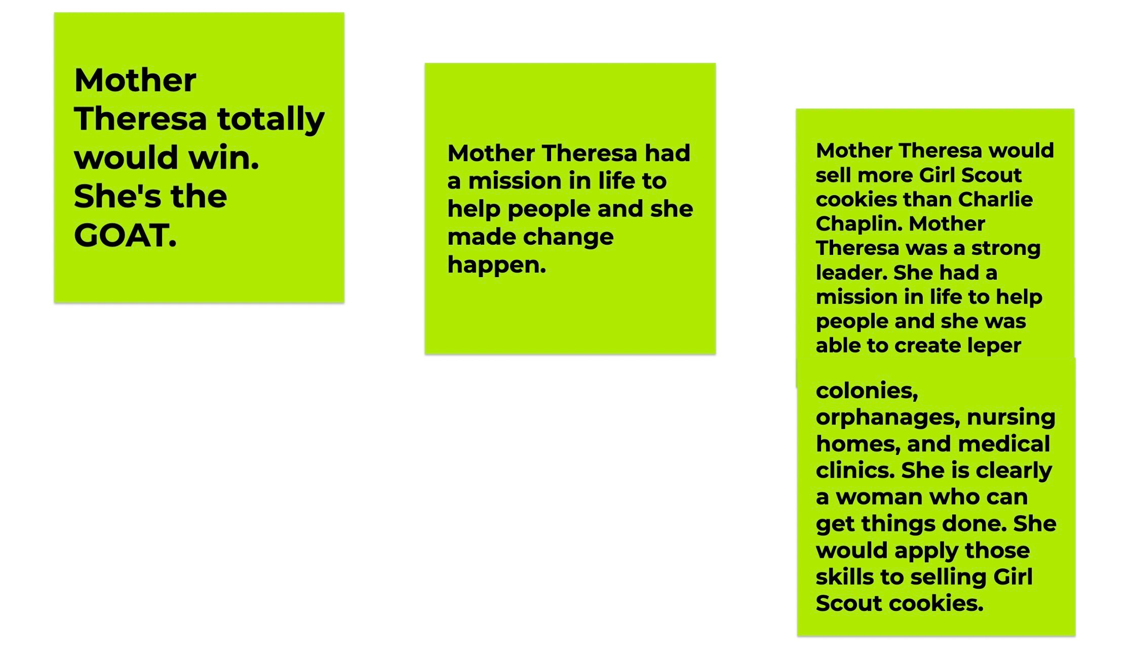 Here’s an anchor chart I’ve used and some sample jots for discussing who would sell more Girl Scout cookies: Mother Theresa or Charlie Chaplin with the book Who Wins? by Clay Swartz. It’s fantastic, by the way.